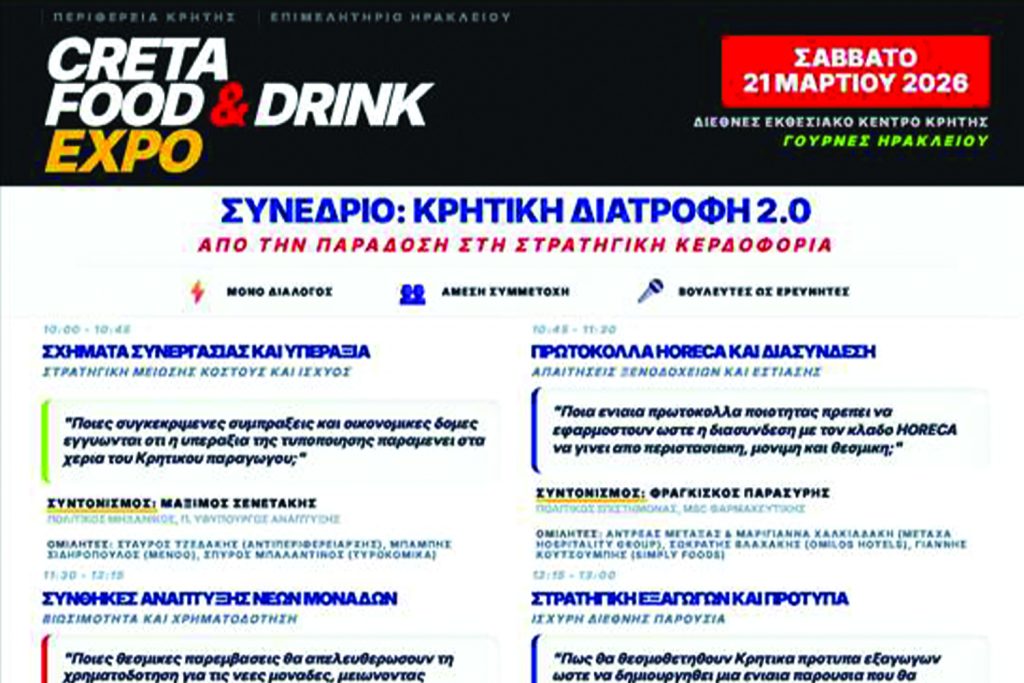 Στη μεγαλύτερη έκθεση τροφίμων και ποτών της Κρήτης CRETA FOOD & DRINK EXPO που θα γίνει στις 20 – 22 Μαρτίου 2026  θα διεξαχθεί καινοτόμο συνέδριο το Σάββατο 21 Μαρτίου 2026 με τίτλο: «Κρητική Διατροφή 2.0» Από την Παράδοση στη Στρατηγική Κερδοφορία.